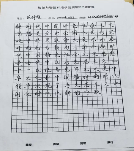 赛前,学院向各位参赛选手传达了比赛的具体流程和规则,要求他们在限定的时间内,精心完成指定内容的硬笔书法作品。比赛现场,参赛者们全神贯注,挥毫泼墨,精心书写每一个笔画。有的选手运笔沉稳,字体工整隽秀;有的选手则笔法灵动,字迹飘逸洒脱。每一幅作品都凝聚着参赛者们的心血与汗水,充分展现出硬笔书法的独特魅力以及当代大学生的文化自信与艺术追求。赛后,评委们秉持着严谨公正的态度,从笔法、结构、章法、艺术性等多个方面对作品进行认真细致的评审,最终评选出一等奖一名、二等奖两名、三等奖三名。