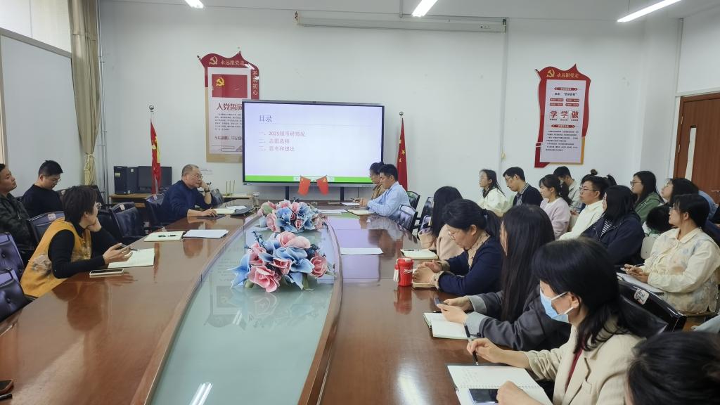李中军对我院2025届考研情况进行了全面剖析。他指出,当前考研竞争日益激烈,学生个体存在差异,学院需以党建为引领,充分发挥党员教师的先锋模范作用,深入调研学生需求,建立“一人一档”考研跟踪机制,针对学生薄弱环节精准施策,切实提升学生的应试能力与综合素质。随后围绕“志愿选择”这一关键环节,李中军详细讲解了查询及掌握录取难度的具体步骤。他强调,要运用好中国研究生招生信息网与招生院校研究生官网,通过查询院校招生简章、复试分数线、一志愿录取名单、调剂方案等文件信息,进行数据比对判定录取难度。通过这一过程,为学生提供全面、精准的信息参考,引导学生结合自身专业兴趣和职业规划,理性评估自身实力,避免盲目跟风填报,确保学生志愿选择既契合个人发展愿景,又提高考研上岸成功率,真正将“以生为本”的理念落到实处。