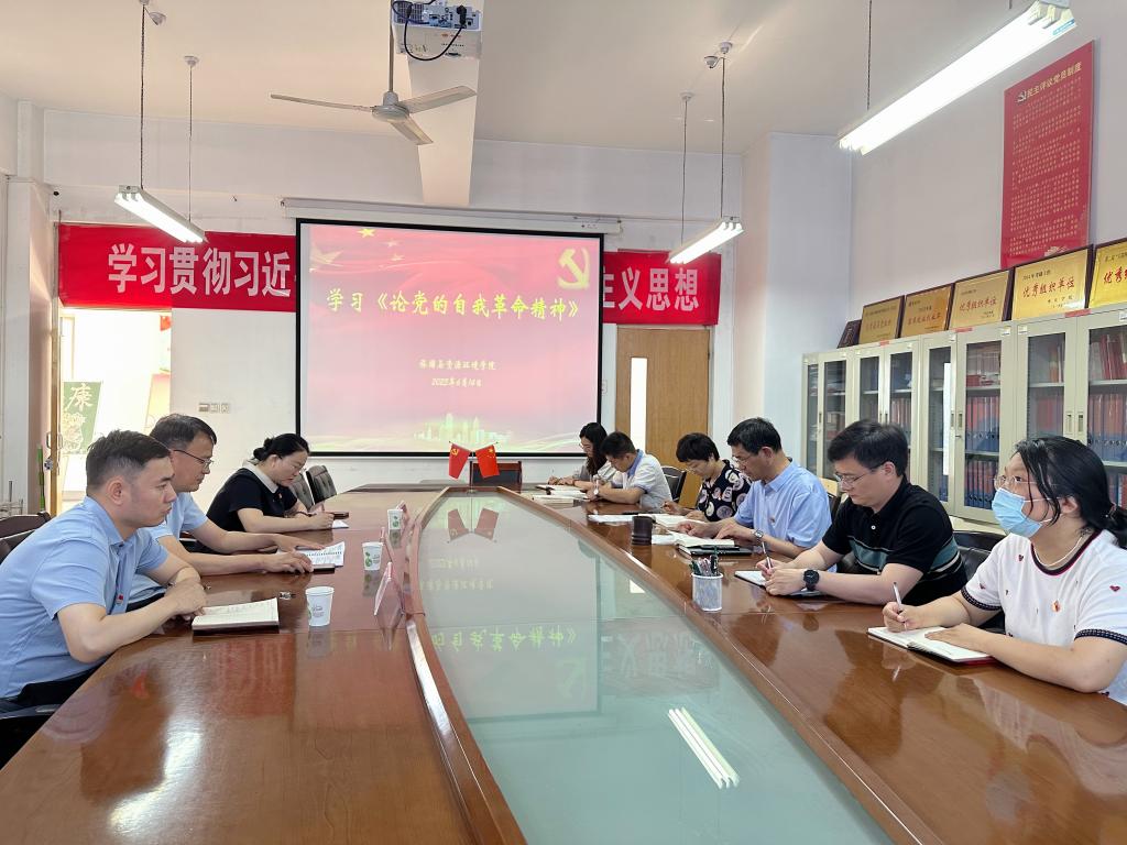 6月14日下午,yl23455永利集团党总支理论学习中心组在理工楼2514会议室开展集体学习活动,专题学习研讨习近平总书记《论党的自我革命》。学院党总支书记刘玉宝主持学习并讲话,学院党政领导、党总支委员参加学习,校党委委员、统战部部长林勇、文学院党总支副书记华莹、统战部统战办公室主任郑欢到会指导。