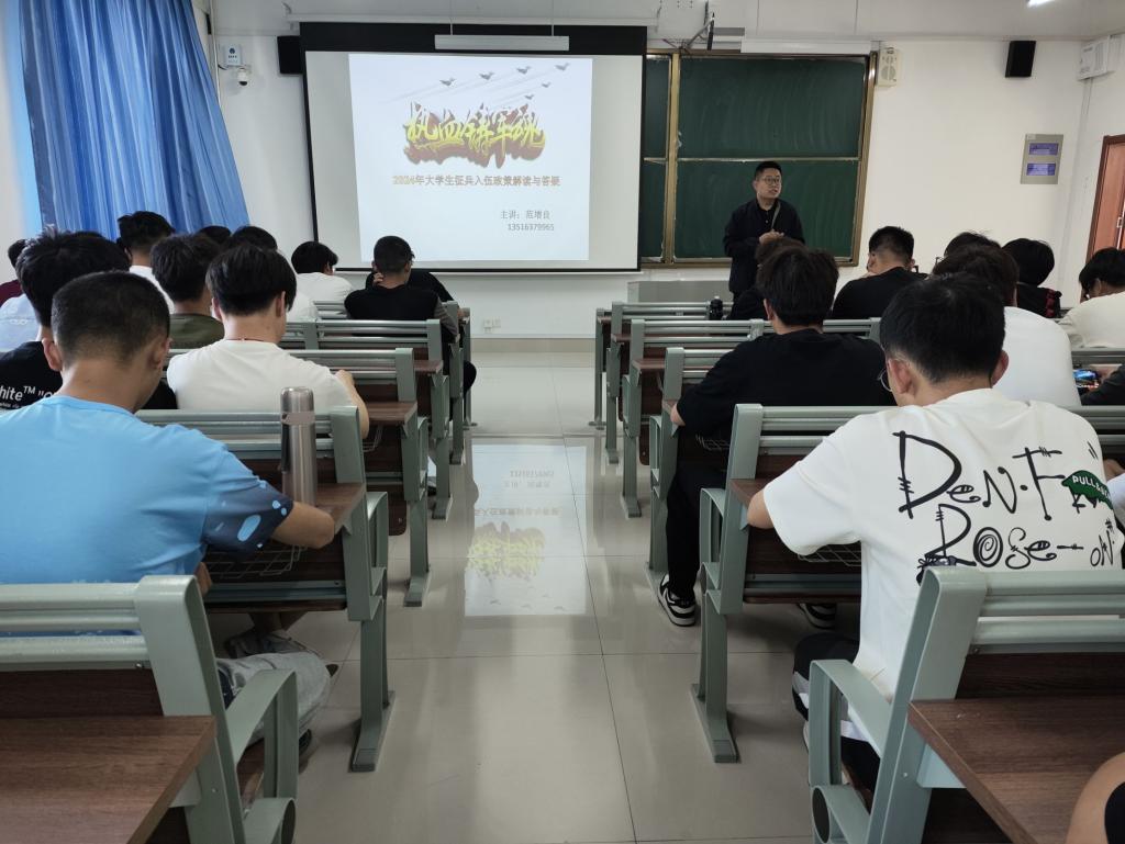 为积极响应国家征兵号召,进一步贯彻学校征兵工作会议精神,鼓励学生应征入伍。5月9日,yl23455永利集团在崇德楼4405教室召开2024年大学生征兵入伍政策解读与答疑宣讲会。本次会议由范增良主持,我院各班级男生参加。