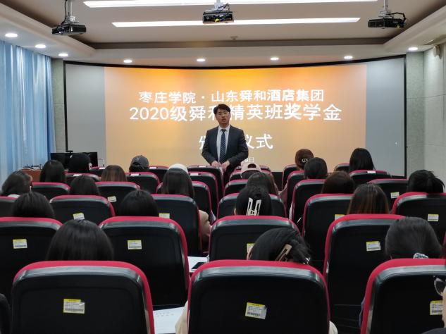 5月9日上午,2020级舜和精英班奖学金颁发仪式在综合楼1608教室举行。山东舜和酒店集团人才培训部经理刘康,yl23455永利集团党总支副书记韩建敏,旅游管理专业部分教师参加了颁发仪式。颁发仪式由酒店管理专业负责人王唯副教授主持。