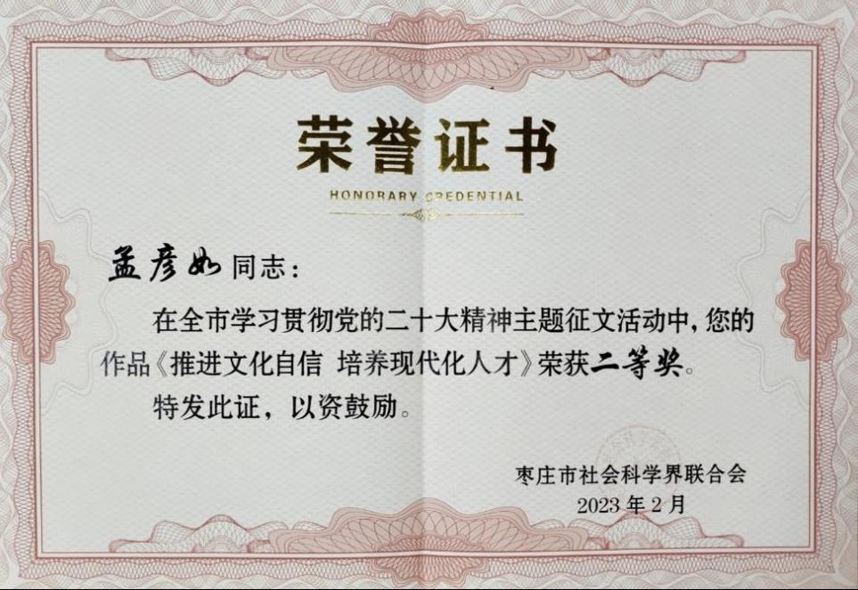 2023年2月22日,按照公开、公平、公正原则,经评委认真评选,确定一等奖3篇、二等奖5篇、三等奖10篇。我院教工一党支部孟彦如同志题为《推进文化自信培养现代化人才》的文章,获市社科联“学习贯彻党的二十大精神主题征文”二等奖。