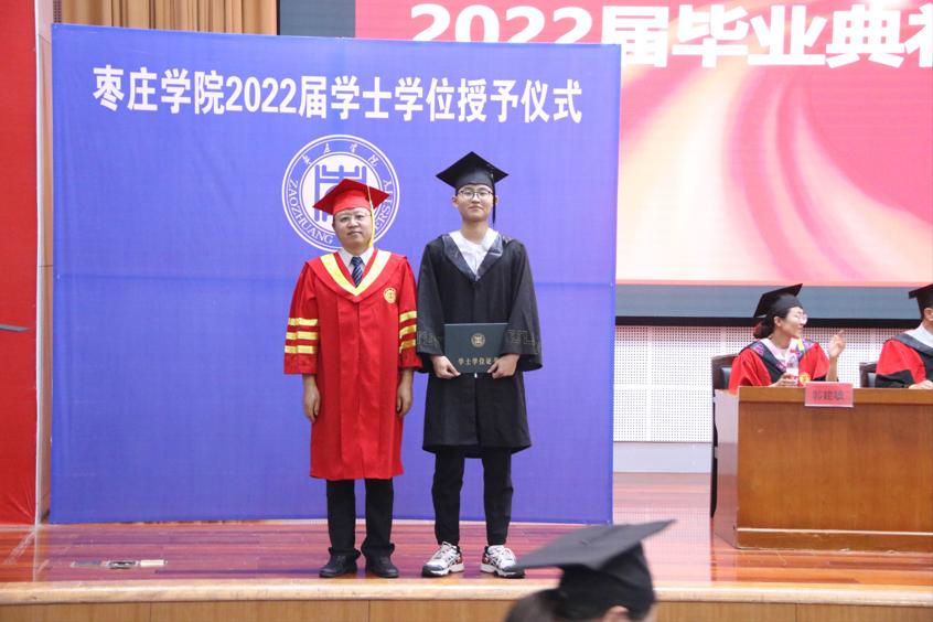 在庄严的国歌声中,学士学位授予仪式拉开序幕。仪式上,院长王满堂致辞,他对毕业生提出三点希望:一是要不断创新和进取,以拼搏奋斗应对挑战,赢得未来;二是要多与学校、学院联系,枣院的大门永远为同学们敞开;三是要心怀祖国,勇于肩负时代使命,投身于祖国建设之中。随后,副院长张大文宣读2022届本科毕业生学士学位授予名单。
