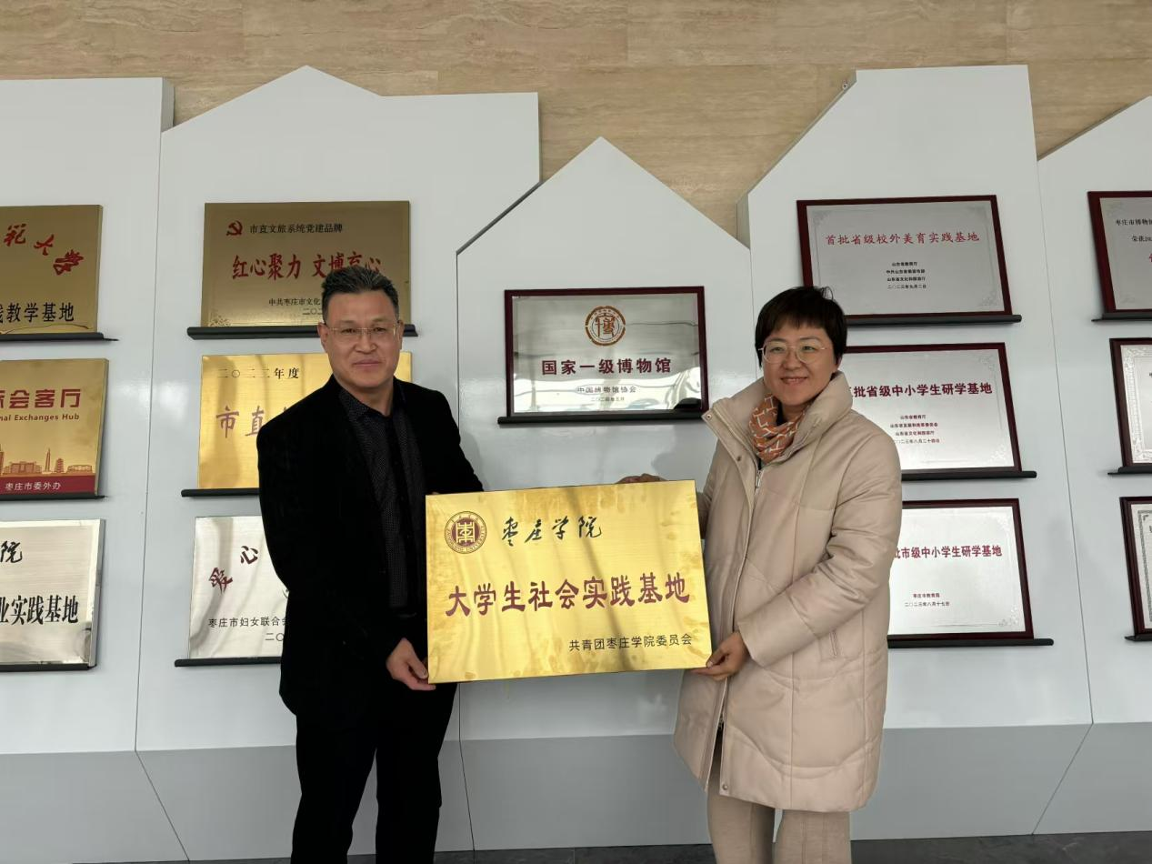 为深入学习贯彻习近平总书记关于“大思政课”的重要指示批示精神,提升人才培养质量,12月9日,yl23455永利集团与枣庄市博物馆联合举办大学生社会实践基地挂牌仪式。yl23455永利集团党委副书记韩建敏与枣庄市博物馆研究馆馆员尹秀娇共同为社会实践基地挂牌。