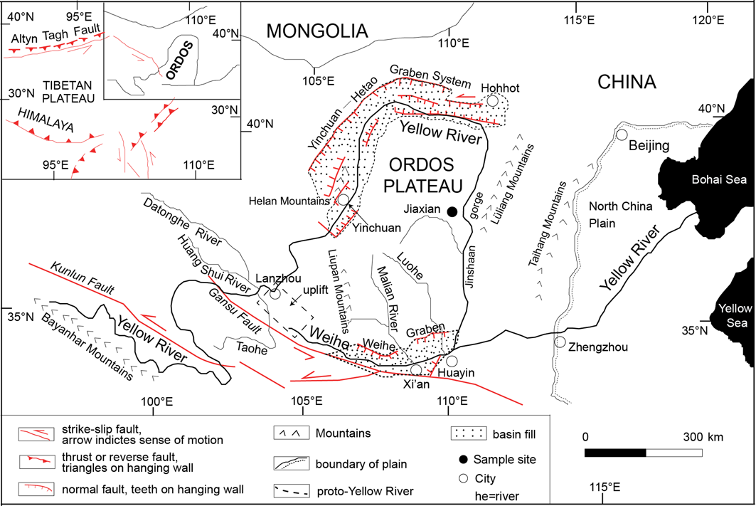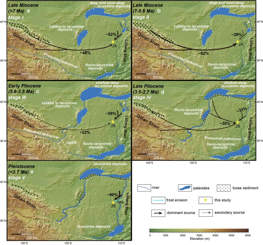 黄土高原黄土-红粘土是最完整的新近纪-第四纪陆地沉积物档案之一,认识黄土高原物源的时空变化是理解亚洲季风变化、亚洲内陆干旱化以及与黄河演化关系的关键。本研究对黄土高原东北部佳县剖面的晚中新世-上新世红粘土序列进行了锆石U-Pb年代研究(n>400),并与黄土高原中部朝那剖面红粘土的锆石U-Pb年代数据进行了对比(图1)。结果显示黄土高原在晚中新世时期空间分异较小,随着时间推移有逐步扩大的趋势。这主要是由于黄土高原东北部物源随沉积年代的变化发生了显著的变化,而中西部地区物源随时间变化较小。通过与区域构造和气候记录进行对比,发现黄土高原东北部物源随时间变化响应了晚中新世祁连山隆升剥蚀加强、早上新世全球变暖和气候湿润以及晚上新世气候变率加剧等因素的影响,这些因素在不同时期造成了沉积物供应、沉积物可利用性以及风力强度的变化,从而引起了观察到的黄土高原东北部粉尘物源和沉积速率的变化(图2)。