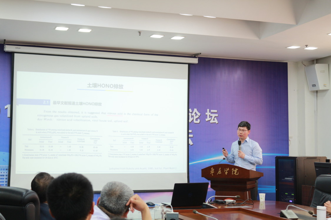 活动分教师座谈和专业学术讲座两个阶段进行。首先,吴电明研究员以“高水平论文写作技巧与方法”为主题与我院相关专业教师充分互动交流撰写高水平科研论文的方法和技巧,使我院教师为以后提高科研论文写作能力奠定了良好基础。同时与会双方就今后进一步交流与合作交换了意见,达成共识。随后,吴电明研究员作了关于《土壤与大气界面HONO气体交换:方法、过程和影响》的研究报告。在报告中,他分别从研究背景、研究方法和研究结论三个方面介绍了他及其科研团队近年来所做的研究工作。