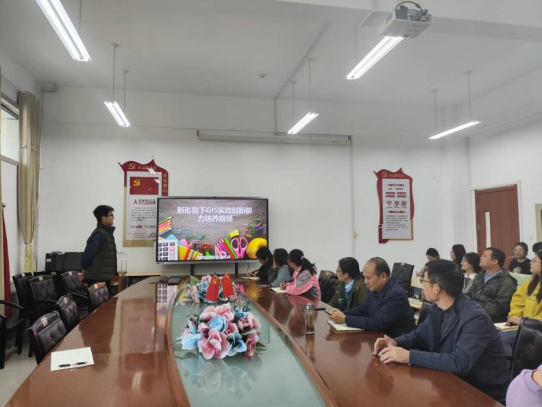陈旭老师以“新形势下GIS实践创新能力培养路径主题,围绕GIS(地理信息系统)教学的创新模式展开,重点介绍了多维教学、项目式学习、案例教学、产学合作与评估体系等多个维度的教学改革思路,为我院GIS教育提供了新的方向和借鉴。同时,深入阐述了GIS教育创新的重要性,强调“线上学习+翻转课堂+实践教学”模式的实际应用,并分享了我校与企业合作、依托学科竞赛等方式提高学生创新能力的典型案例。这些实践不仅让学生在真实项目中获得实践经验,也显著提升了他们在GIS领域的专业技能和创新意识。此外,报告还结合案例与数据分析,展示了校企合作和产教融合在学生综合素质培养方面的成效,充分证明了创新型教学模式对人才培养质量的积极推动作用。