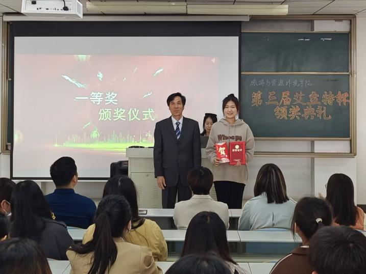 在本届"艾立特"杯旅游创新大赛中,我院有16组作品获奖,奖金总计6500元,其中张天奕与艾厚禄的《金风台城一相逢》荣获一等奖。颁奖典礼上,谢龙飞向获奖同学颁奖并表示祝贺,他指出大赛作为推动创新型人才培养的有效方式,对于增强同学们的社会责任感、创新能力和实践能力具有独特作用,并寄语同学们要积极探索、以赛促学、不断创新、不断进步,成长为一名能担当大任的旅游人。