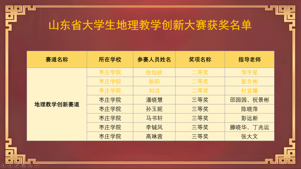 开赛以来,学院全力提供丰富资源、专业培训与全方位支持,为参赛选手奠定坚实基础。指导老师精心协助选题策划,悉心指导教学设计,并组织模拟演练,助力提升参赛水平。参赛选手通过深入学习地理知识,创新设计教学方案,不断实践调整,精心准备展示内容。最终,在学院的支持、指导老师的悉心栽培以及参赛选手的不懈努力下,多个参赛作品成功崭露头角,斩获佳绩,充分展现了我院地理学子的风采与能力。