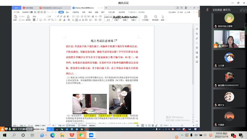此次班会主要内容主要有三部分,一是由班主任老师传达学生线上考试注意事项,对线上考试注意事项做出详细解释,保证每位学生熟知考试流程和规则;二是对全体学生进行诚信应试教育,考试期间如发现作弊或存在违规行为将面临处分,同时要求每位学生以群内接龙或手写承诺书的方式做出本次诚信应试承诺;三是班主任老师深入了解学生在此次线上考试中存在的困难和问题,及时帮助学生解决问题并反馈给学院,保证本次线上考试顺利展开。