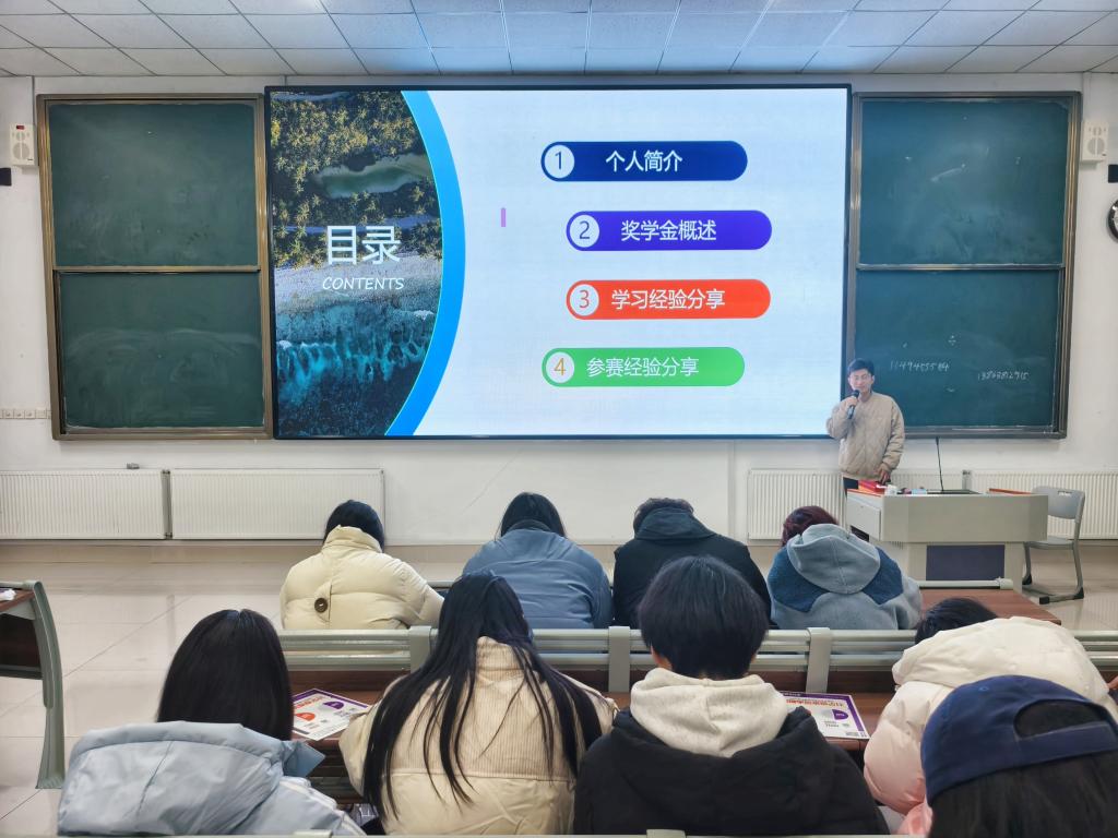 2023-2024学年卓越之星奖学金、省政府励志奖学金获得者王璐璟围绕学科比赛、实践创新、社团活动等多个方面分享。王璐璟首先强调了树立学习目标,平衡学习和工作关系,参加学科竞赛,积累竞赛经验的重要性。其次强调了学生干部拥有突出的组织能力,发挥带头作用参加社会实践,锻炼实践能力的必要性。最后激励同学们勇于实践,敢于创新,并结合个人经历给出了详细、有效的建议。