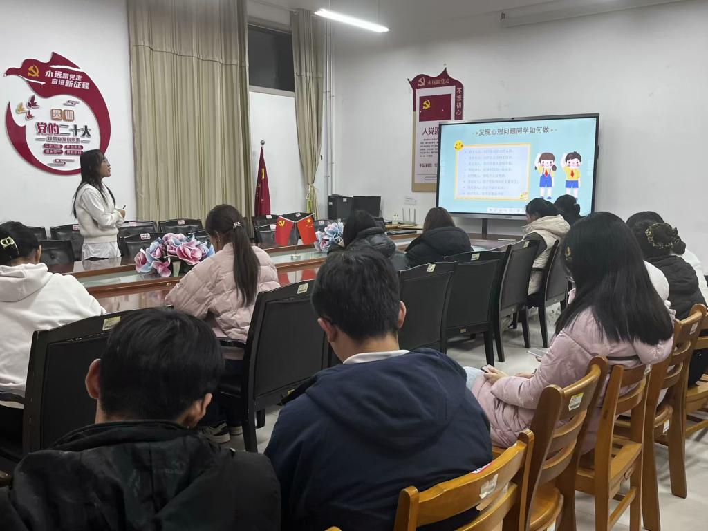 会议伊始,冯淑鹃通过各类案例分析,围绕心理健康知识概述、心理委员的职责和定位等方面展开讲解,帮助心理委员们深化对心理健康的理解与认识。随后,冯淑鹃对大学生常见的心理问题进行深入剖析,传授有效的防范措施和识别方法,以此加强心理委员对心理危机的预防、干预能力。冯淑鹃强调,心理健康是青年学习和生活的基础,各班心理委员要积极发挥班级心理健康“导航员”作用,不仅要保持良好的心理素质,还要具备敏锐的观察力切实提高学生的心理健康保障水平,为呵护班级学生的健康成长贡献自己的力量。