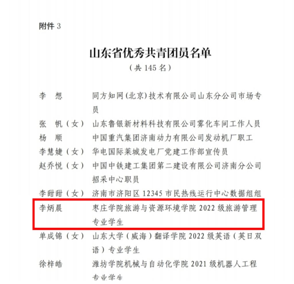 近日,共青团山东省委公布《关于表彰2023-2024年度“山东青年五四先进集体“山东青年五四先进个人”的决定》,我校yl23455永利集团2022级旅游管理专业学生李炳晨荣获“山东省优秀共青团员”荣誉称号。
