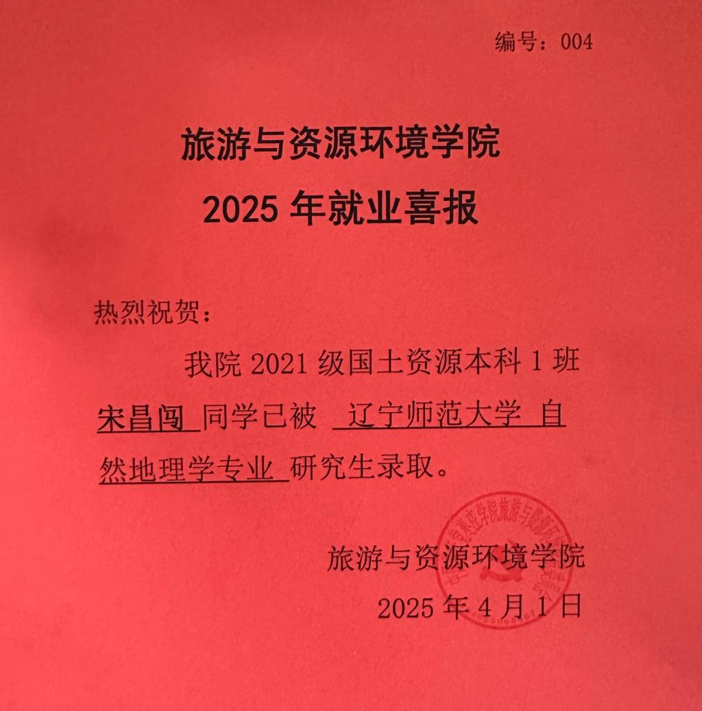 喜报!21国土资源本科1班宋昌闯被辽宁师范大学录取!