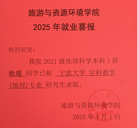 喜报!21地理科学本科1班徐瑶被宁波大学录取!