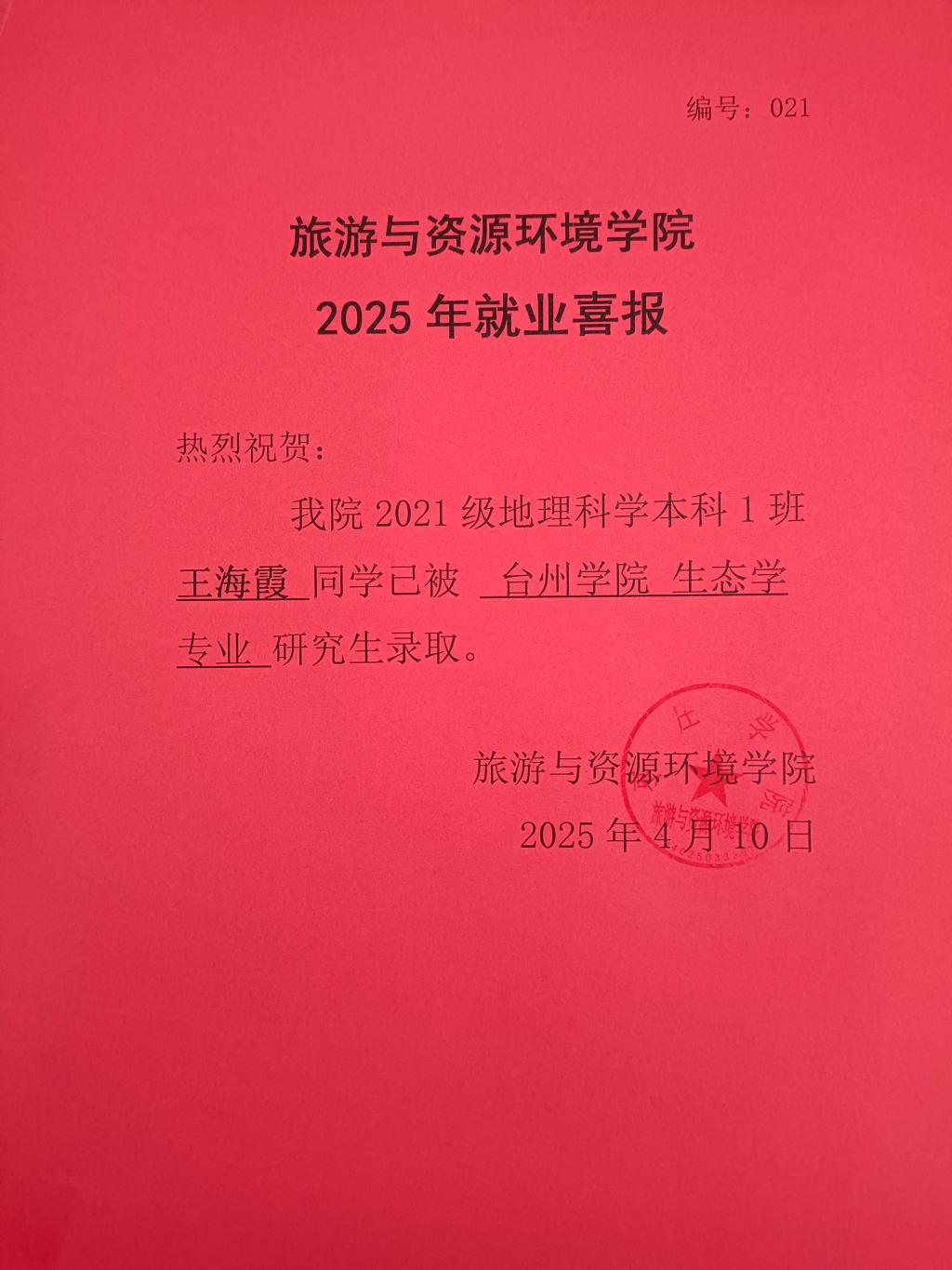 喜报!21地理科学本科1班王海霞被台州学院录取!