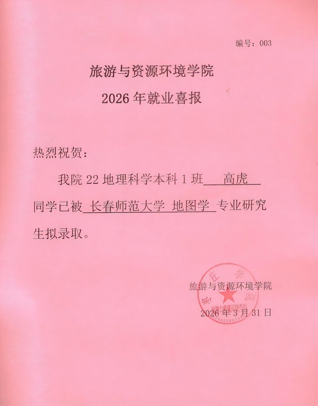 喜报!22地理科学本科1班高虎被长春师范大学录取!