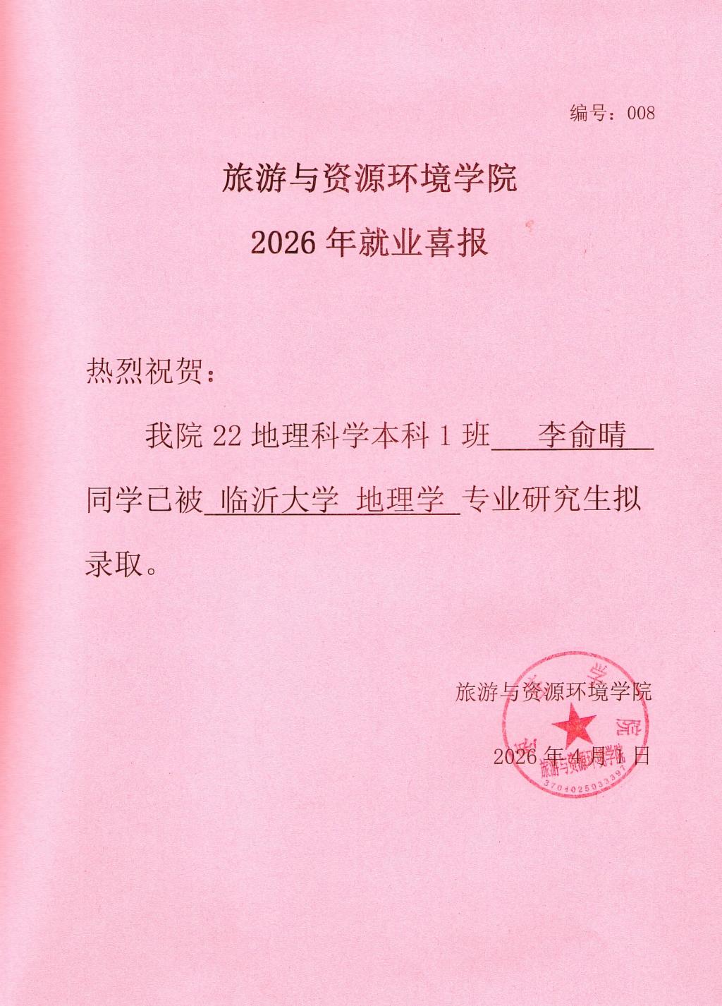 喜报!22地理科学本科1班李俞晴被临沂大学录取!