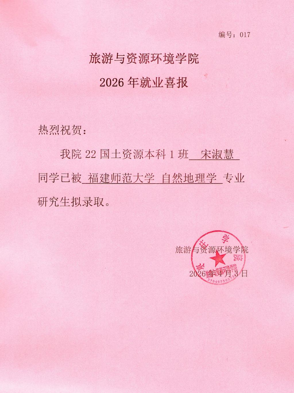 喜报!22国土资源本科1班宋淑慧被福建师范大学录取!