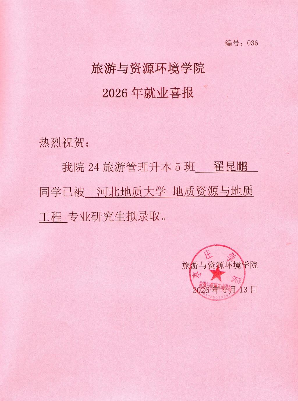 喜报!24旅游管理升本5班翟昆鹏被河北地质大学录取!